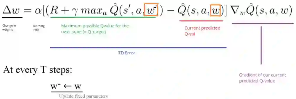 然而,问题是我们使用相同的参数(权重)来估计目标和Q值。结果是,TD目标与我们正在改变的参数(w)之间存在很大的相关性。