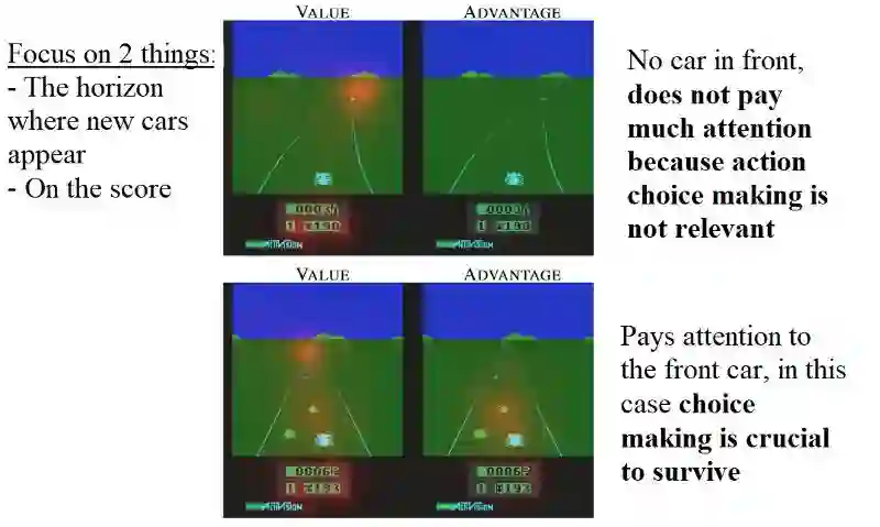 (译者注:V(s)关注于地平线上是否有车辆出现(此时动作的选择影响不大)以及分数;A(s,a) 则更关心会立即造成碰撞的车辆,此时动作的选择很重要。)