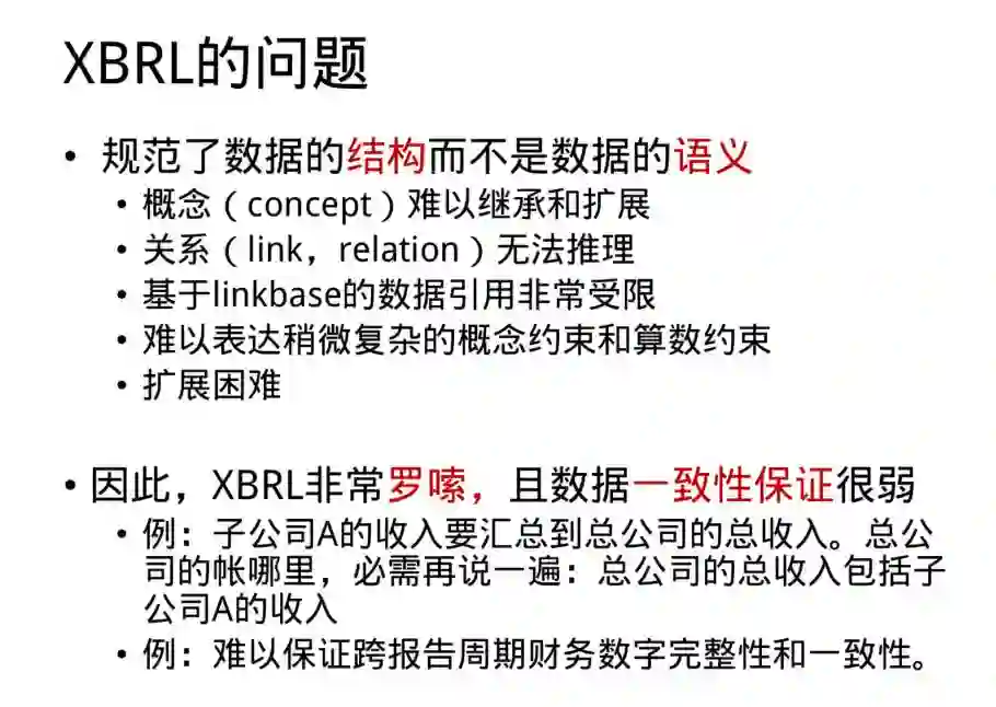 再比如说一致性的检查,跨报告周期的财务数据的完整性和一致性,这也是没有办法内生地去检查的,只能让程序员在外面写个规则来做检查。在MIT的时候,我们就做了XBRL的语义化,用一种逻辑的语言来描述XBRL,然后再用一些规则,就是SPARQL这种语言来表示规则。具体的内容就不再多说了,因为都比较技术的东西,回头我会把这个ppt发给大家,有感兴趣的可以跟我联系。