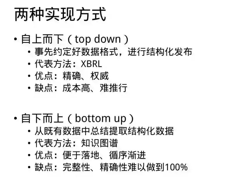 怎么推进下去?最近几年时间,大家开始想能不能咱们不对信息发布的时候做这么高的要求。我们已经有了一些发布的数据,比如说各个公司都有年报,都有披露的材料、季报,还有股转书,这其中有很多反复出现的数据,能不能从既有的数据里面,把它结构化的部分先提取出来,这就是一种总结的方法,现在这套方法也就是我们最近这几年兴起的知识图谱的方法。