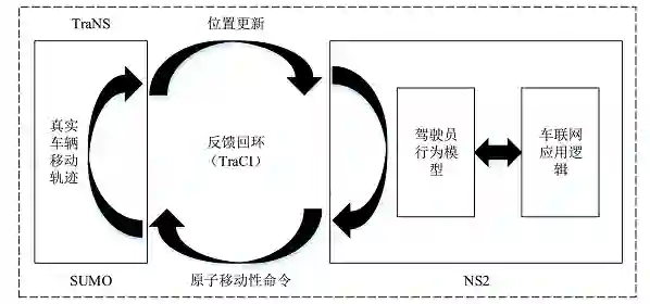 TraNS 是开源的车联网仿真平台,提供两种操作模式,第一种是以网络程序为中心的模式,主要用于不影响车辆节点的实时移动性的网络程序,如数据交换和音乐下载等;第二种模式是以应用程序为中心的模式,专门用于在交通仿真运行期间影响车辆行为的应用,如紧急警报和防撞应用。
