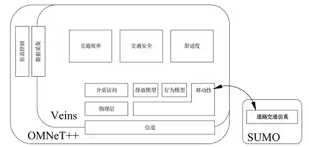 它支持并扩展了两个非常成熟的仿真器:基于事件的网络仿真器 OMNeT++ 和交通仿真器 SUMO,为车联网仿真提供了一套全面的模型。Veins 也使用了 TraCI 接口,两个仿真器通过 TCP 套接字连接,允许道路交通和网络交通的双向耦合模拟。车辆在 SUMO 中的移动被映射为 OMNeT++ 仿真中节点的移动。