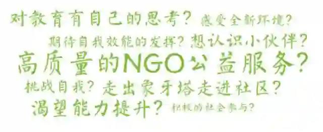 走出舒适区,在全新的环境中深入了解新的地点新的社区,收获高质量的NGO公益服务体验。或许这是你的第一次公益体验,或许这是你关于教育思考的一次实践,奇妙、真诚、难忘……有无限的形容词为这段经历加冕。