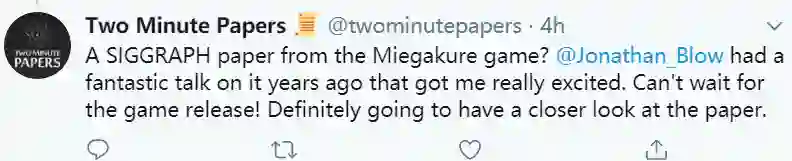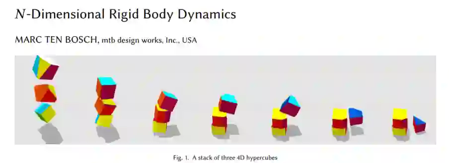 这种情景我们通常只会想象一下,毕竟在现实生活中是体验不到的。但也有人对此兴味盎然,将其搬到了游戏世界中,甚至还凭借游戏的论文中了计算机图形学顶会 SIGGRAPH。 在这篇论文中,研究者提出了一个适用于任何空间维度的刚体动力学公式。用几何代数来描述刚体的状态和运动方程。他将碰撞检测算法扩展到𝑛维,解析了物体之间的碰撞和接触。虽然作者实现的是四维,但该方法可以扩展到任意维度。他通过这些四维刚体的三维截面来展示他们,用户可以实时操纵这些物体。 不同于常见的研究,这篇 6 页的论文充满了各式各样的几何代数公式。在双盲审稿过程中,一位审稿人对该论文的评价是:「异想天开(whimsical)」。 大部分研究工作都是从 2012 年开始的,但作者也根据审稿人的建议增加了关于神秘翻转(Dzhanibekov effect)的部分。 在此之前,物理模拟一直集中并局限于二维和三维的情况。但作者提出,使用所需方程式的恰当公式,就有可能将它们推广到更高维度。几何代数提供了一个简单的与维度无关的公式,可以实时操作相互碰撞的 n 维物体,就好像它们是真实的物体一样。这使得这些高维物体不那么抽象,和大多数人对它们的体验形成鲜明对比。 这篇论文的贡献在于: 1、将基于几何代数的经典三维刚体动力学公式推广到了 n 维。通过将几何代数算子表示为矩阵,以一种简单的方式构建、对角化(diagonalize)、转换任意 n 维简单网格,无论这个 n 是多少。这样一来,就可以在 n 维中建立欧拉方程,比如研究四维欧拉方程在无力矩条件下的情况。 2、计算 n 维中的碰撞和接触处理过程,包括静摩擦和动摩擦。作者给出了 Minkowski 差分法和基于几何代数的分离轴定理碰撞检测方法的 n 维公式。 3、提出了一种类似于我们对现实三维空间体验的四维物体互动方法。 也许这篇论文最大的意义在于,它为我们提供了一种从侧面了解四维空间的方式。 基于这篇论文中提到的技术,论文作者 Marc ten Bosch 开发了两款游戏,上面动图展示的就是其中一款游戏——「4D Toys」。这款游戏旨在以三维视角展示四维物体在四维空间里的特性。有人表示,该游戏就像在向一位盲人解释颜色的含义。目前,该游戏已经在 Steam、IOS 等平台上线。 除此之外,他还打造了另外一款 4D 游戏「Miegakure」。在这个游戏中,一系列平行的 3D 世界因谜题而串联在一起,玩家可用视角转换的方式触发穿越机制,到达其他的 3D 场景。