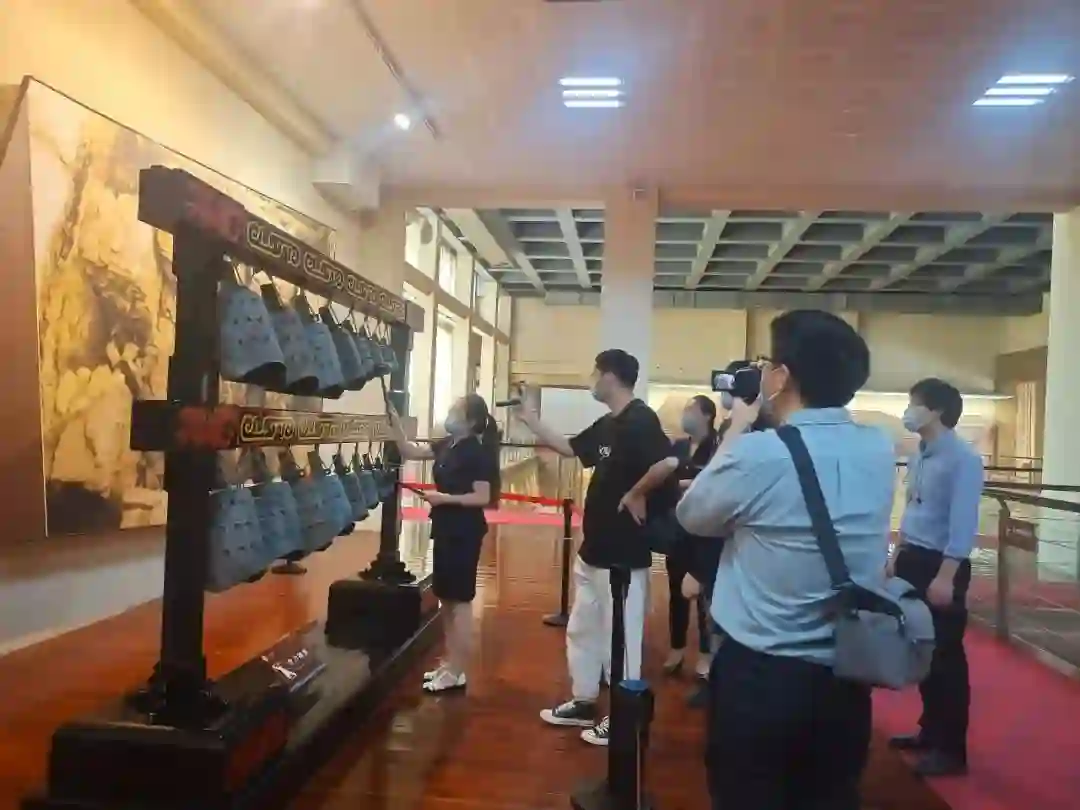 图 2 讲解员在直播现场讲解图 3 直播现场敲击编钟