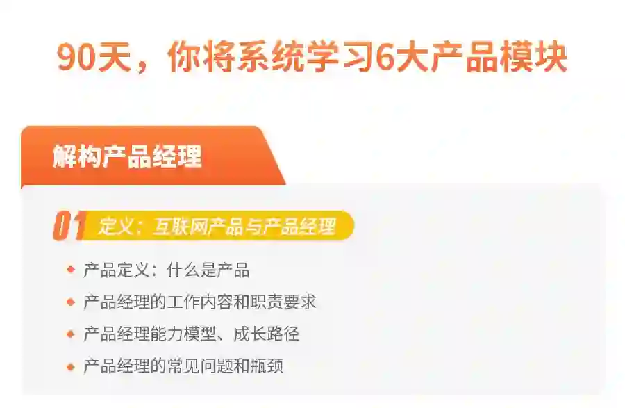 90天,围绕所学的不同模块进行5次实战,充分吸收所学知识,产出物非常明确!以大厂产品经理能力模型为蓝本,系统化安排学习,围绕产品经理从0到1的工作流程展开。