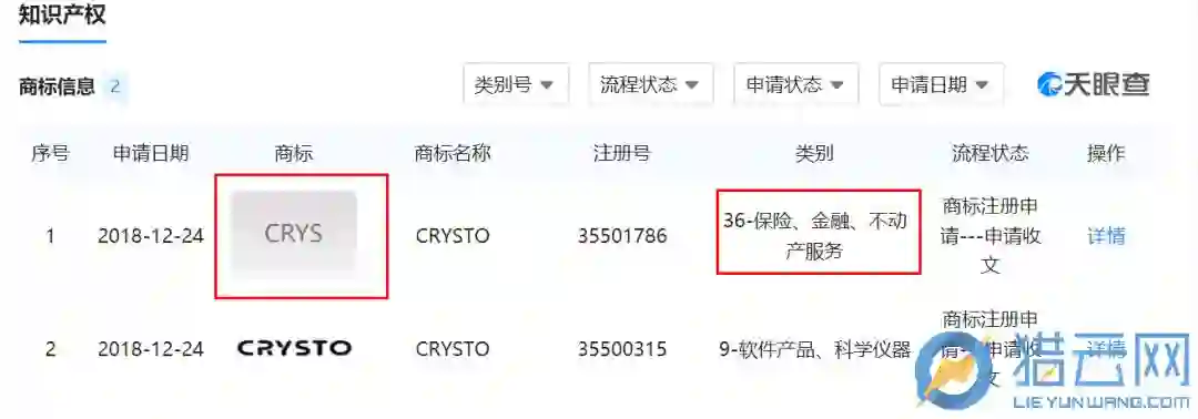 另外,据天眼查显示,水晶区块链已于2018年12月24日成功注册了2个商标,其中商标“CRYS”所在类别是36类-保险、金融、不动产服务;而另一商标是CRYSTO。值得注意的是,李国庆投资的公链就叫CRYSTO。
