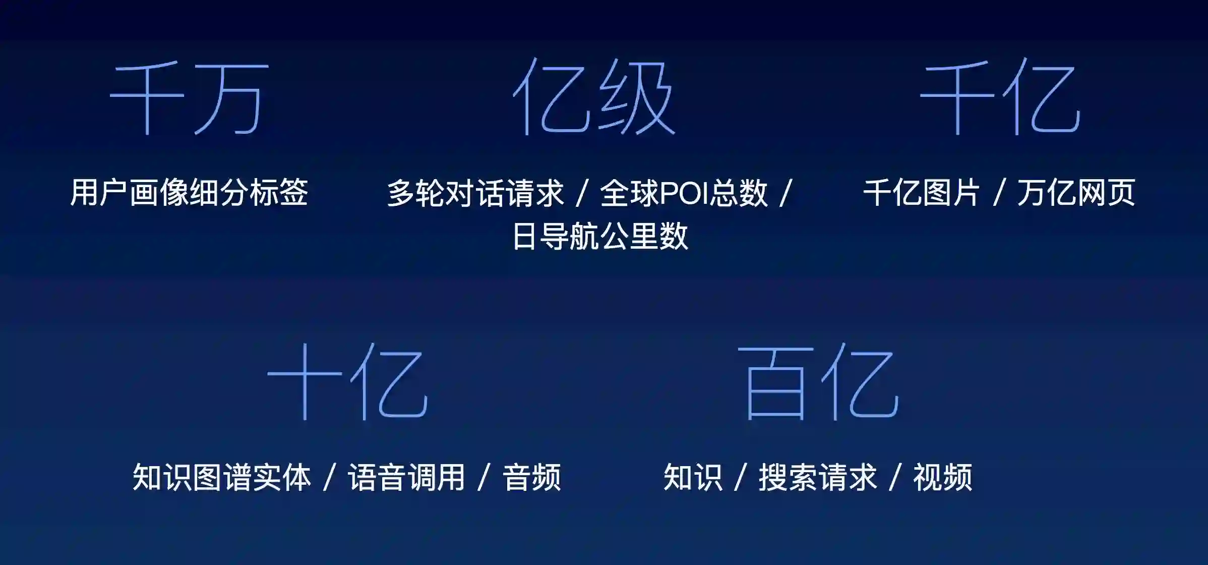 让我们简单看一下百度大数据的“家底”,其实用两个短语就可以概括:万亿级搜索数据,百亿级定位数据。