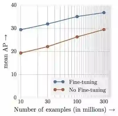 在 JFT-300M 不同子集上的预训练后,进行物体检测的性能。x 轴表示对数刻度的数据集大小,y 轴是 COCO-minival 子集中 mAP@[0.5,0.95]中的检测性能。