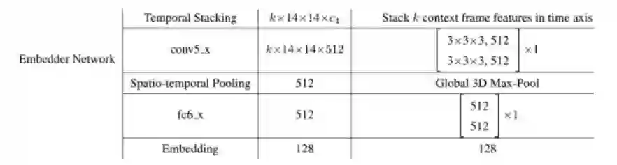关于Encoder,使用的是VGG-M/ResNet50。而Embedding Network结构如下,加入3D卷积和3D池化,在补充材料中作者说到,即使在 k=2 情况下,性能也较好。