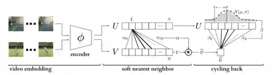 我们首先计算视频U中的ui在视频V的soft nearest neighbor,然后再反过来求