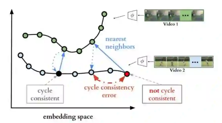 该文的目标是自学习embedding spaces,使得视频1和视频2尽量对齐。如下图所示,1) 首先对视频1和视频2若干帧映射到embedding spaces,左边的每个圆圈表示每帧的表征;2) 接着在视频1中寻找视频2当前帧(黑色和红色的圆圈)中的nearest neighbors(即实线蓝色箭头对应的两个绿色点);3) 最后cycle-back,用同样的方法寻找视频2中对应视频1两个绿色点nearest neighbors。这里产生的cycle consistency error就作为模型的Loss。