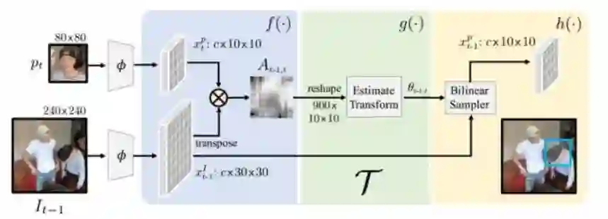 首先我们来看可微分tracking operation,简单的patch matching过程。如下图所示,1) 首先对当前帧需要跟踪的patch和上一帧,提取下采样8倍的Mid-level feature,进行L2正规化,通过点乘计算Affinity矩阵后Softmax;2)接着通过两个卷积层和一个全连接层,定位出仿射变换的三个参数,2D平移和旋转;3)最后进行双线性sample,得到匹配后区域的特征。