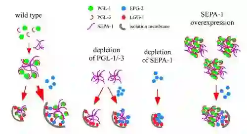 前期课题组发现,秀丽隐杆线虫胚胎发育过程中PGL颗粒组分PGL-1和PGL-3(cargo)被自噬选择性降解。进一步研究发现,P颗粒组分的降解过程是通过受体蛋白SEPA-1(receptor)和支架蛋白EPG-2(scaffold)介导的,且受体蛋白SEPA-1和支架蛋白EPG-2最终也被自噬降解。在该研究中,科研人员深入研究了PGL颗粒的组成对自噬降解效率的影响。研究发现,PGL-1和PGL-3的缺失可以促进SEPA-1和EPG-2的降解,并且SEPA-1的缺失可以促进EPG-2的降解。他们同时还研究了不同种类的蛋白质聚集体之间的关系,发现过表达PGL颗粒或者是SQST-1(线虫中p62的同源蛋白)聚集体不会对另外一类蛋白质聚集体产生明显的影响。综合上述现象,研究人员认为蛋白质聚集体的降解受到组分的影响,并且受到多种水平的调节。