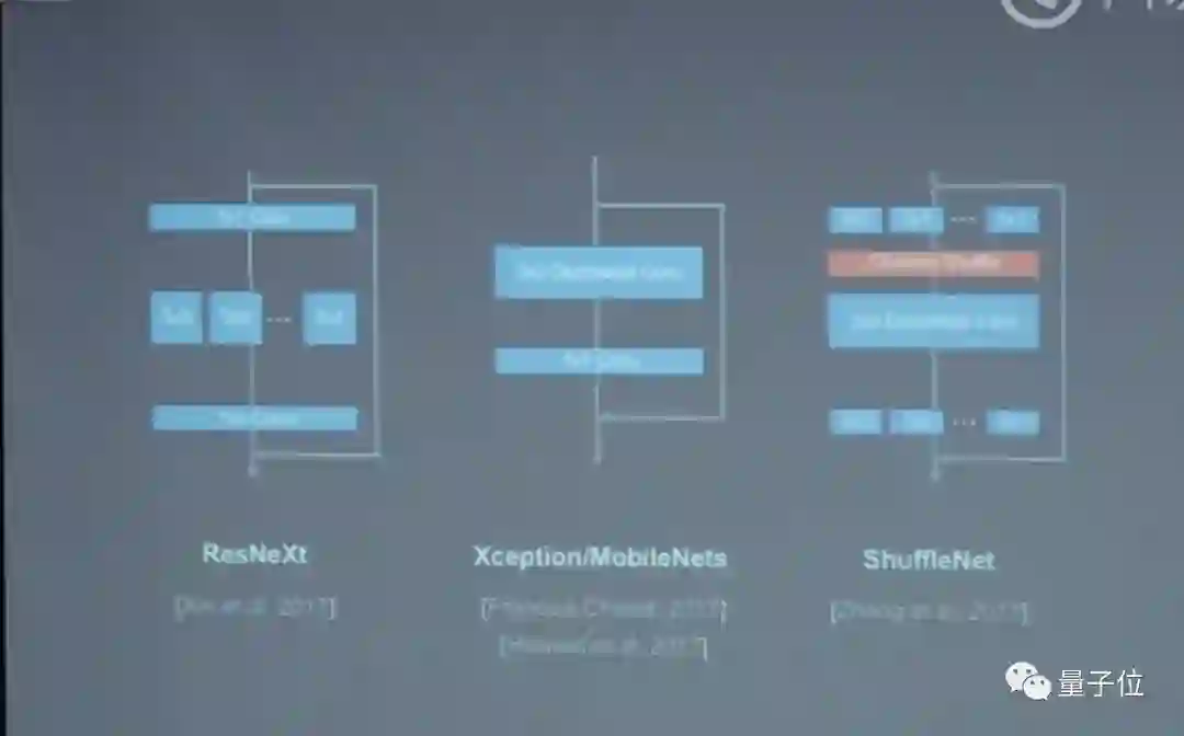 针对低精度的运算,Face++ 去年做了一个工作是 ShuffleNet,它是专门解决在低计算复杂度下如何能把精度做到最高程度的问题。ShuffleNet 的设计原理是:把输入的 channel 拆成很多的组,拆成组以后做 channel shuffle 的操作,把信息交换,然后再做一个 3D 的 shuffle 卷积,然后再分组卷积。分组卷积可以很有效地降低计算复杂度,但会丢失一些性能,需要自主判断如何折中。