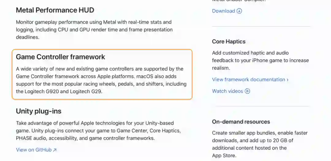Apple 除了通过 Metal 在游戏的软件领域发力,硬件方面也支持了越来越多游戏外设。目前,macOS 已经支持了连接 PlayStation 和 Xbox 的游戏手柄,并使用这些第三方的手柄来玩游戏。Apple 在官网的