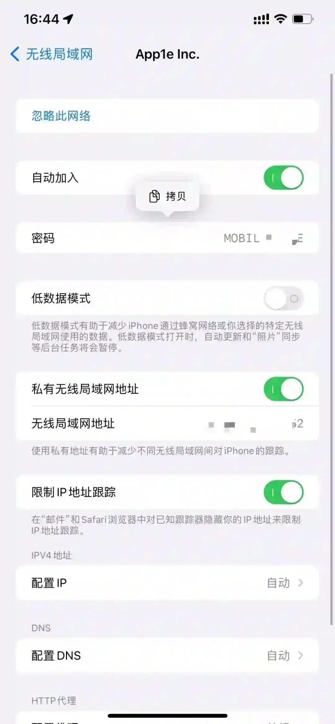 不知道是出于什么考虑,先前 iPhone 上已经连接的 Wi-Fi 也无法查看密码,这一窘境在 iOS 16 中得到了解决。点击已连接 Wi-Fi 右侧的详情按钮,然后单击密码一栏,就会弹出 Face ID 或者 Touch ID 的验证窗口,验证通过后我们就可以在密码一栏看到明文的密码了。如果你想要复制 Wi-Fi 密码,只需要长按显示出的密码,就会弹出复制的按钮。