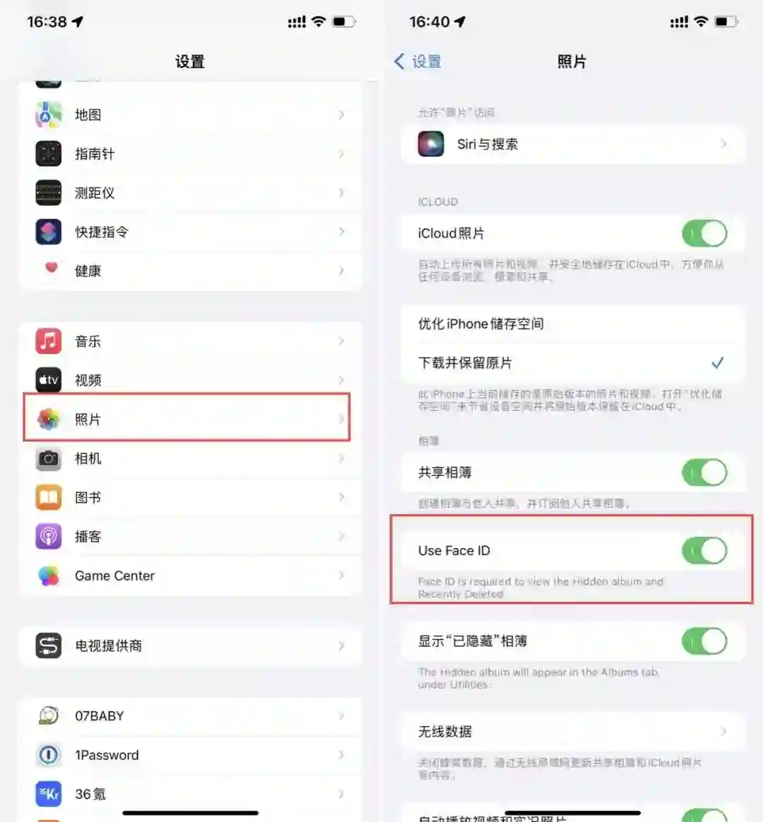 当然,如果你不想要这个相册加密的功能,也可以在设置中找到照片,然后关闭 Use Face ID 或者 Use Touch ID 的选项。