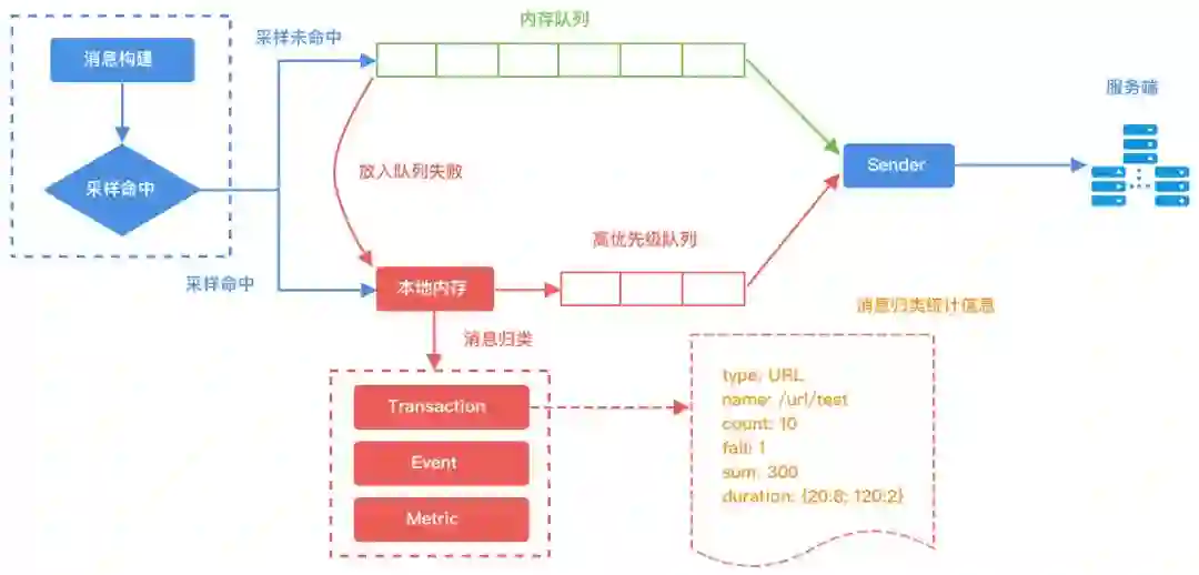 消息采样聚合在客户端应对大流量时起到了至关重要的作用,当采样命中或者内存队列已满时都会经过采样聚合上报。采样聚合是对消息树拆分归类,利用本地内存做分类统计,将聚合之后的数据进行上报,减少客户端的消息量以及降低网络开销。