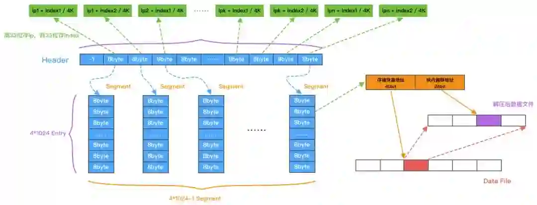 新版消息文件存储为了同时兼顾读写性能,引入了二级索引存储方案,对同一个应用的 IP 节点进行合并,并且保证一定的顺序存储。下图是索引结构的最小单元,每个索引文件由若干个最小单元组成。每个单元分为 4 * 1024 个桶,第一个桶作为我们的一级索引 Header,存储 IP、消息序列号与分桶的映射信息。剩余 4 * 1024 - 1 个桶作为二级索引,存储消息的地址。