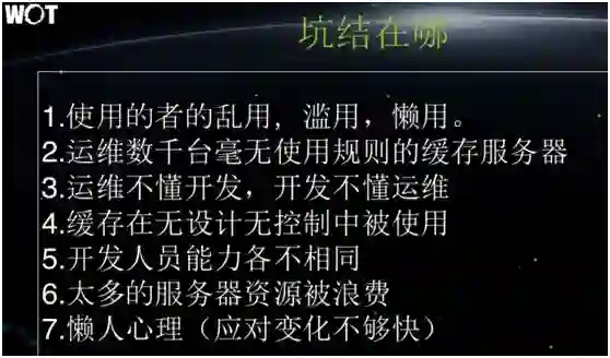 懒人心理,应对变化不够快。应对高并发量,十个程序员有五个会说:为数据层添加 Cache,而不会真正去为架构做长远的规划。