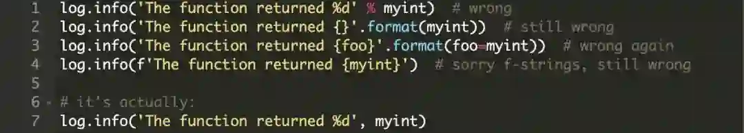 每个人都应该知道,你需要记录日志,尤其是在开发的时候。并且在记录日志的时候,不应该使用常规的 Python 字符串语法,它有自己的 基于 *arg 的解包语法: