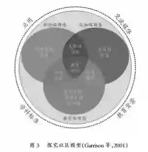 作为一个新兴的实践与研究领域,混合式教学迫切需要一个理论框架来指导其设计与实施。目前,在混合式教学领域,最有影响力的理论框架莫过于Garrison、Anderson和Archer于2001年提出的探究社区模型(Community of Inquiry),如图3所示。