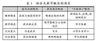 随着互联网与移动技术的迅猛发展,特别是“互联网+(时代的到来,2013年以后,混合式教学的概念也有了新发展。在物理特性维度,移动技术的应用被正式纳入混合式教学的概念中。混合式教学的概念由“在线教学与面授教学的混合”,正式演变为“基于移动通信设备、网络学习环境与课堂讨论相结合的教学情境”[10]。