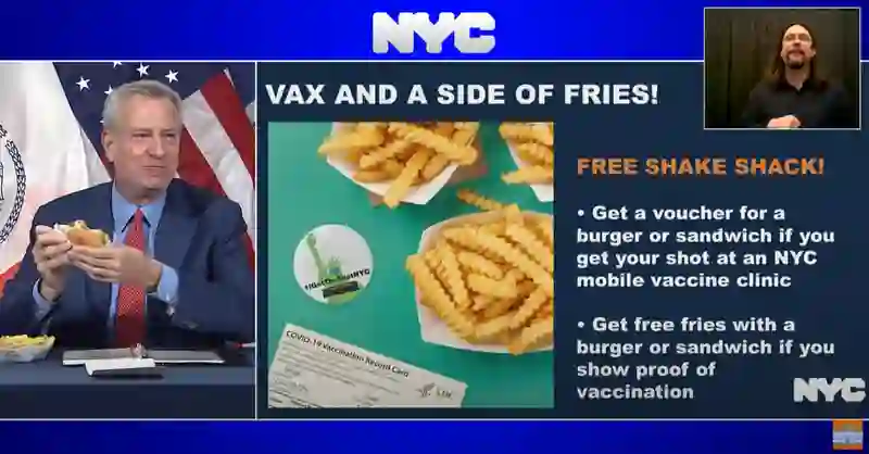 疫情期间,纽约市长白思豪为了呼吁市民接种疫苗,拿出Shake Shack招牌菜作饵,接种了的进店消费送Shake Shack招牌薯条,没接种但前往移动巴士接种疫苗的,送一张ShackBurger兑换券。过去是食客称Shake Shack为纽约味道,这次则是官方盖章其“纽约市堡”的地位。