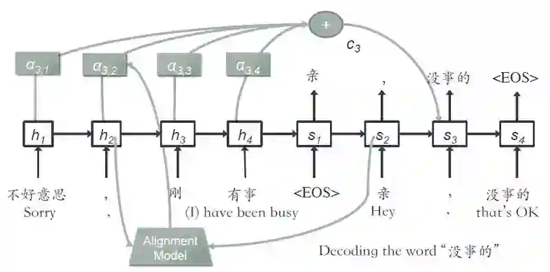 其中加了 context 向量,他是由图中的 α 求得的,α 表示的是当前步的输入单词,和上一步的生成单词之间的匹配度,用了一个 alignment 模型计算。