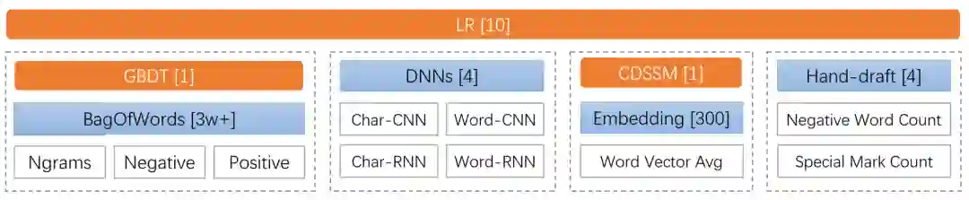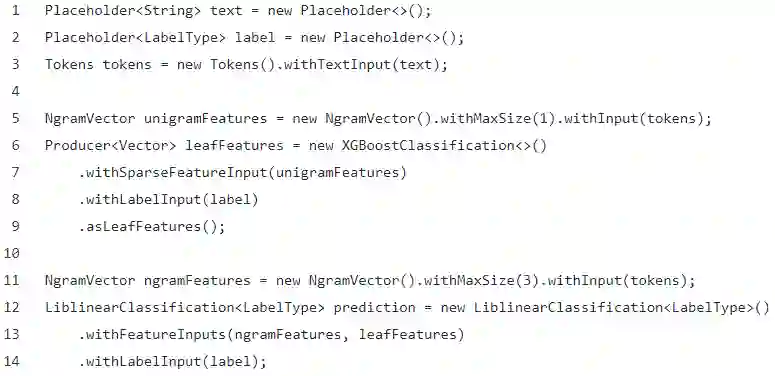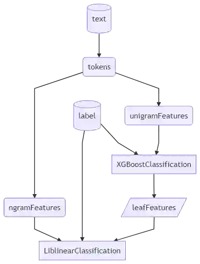 为了具体了解 Dagli 是如何工作的,让我们从一个文本分类器开始,这个文本分类器使用梯度增强决策树模型(XGBoost)的活动叶片,以及一组高维的 N-gram 作为 LR 模型分类器的特征: