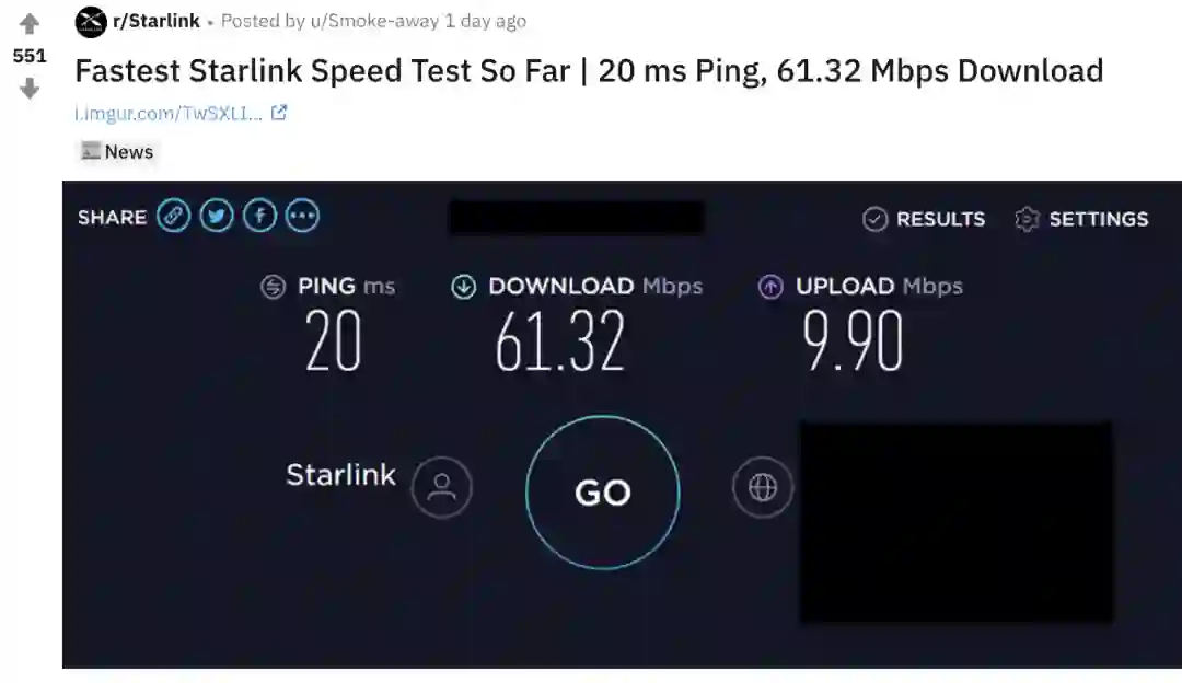 Reddit 用户还放出了更多的 SpeedTest 测试结果,其中Starlink测试中速度效率比较好的一次已经达到了下载速度61.32Mbps,上传速度9.90Mbps,