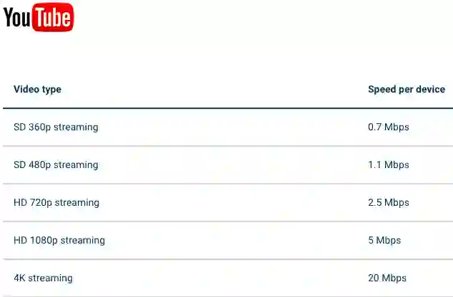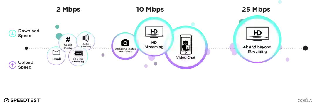 发邮件、社交媒体大约需要2Mbps,高清直播、视频通话等需要10Mbps,4K高清直播大概需要25Mbps。
