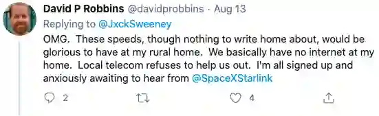 一位生活在农村的网友表示,他所处的地区基本上没有互联网,而当地的电信公司拒绝提供了帮助,很期待Starlink网络。