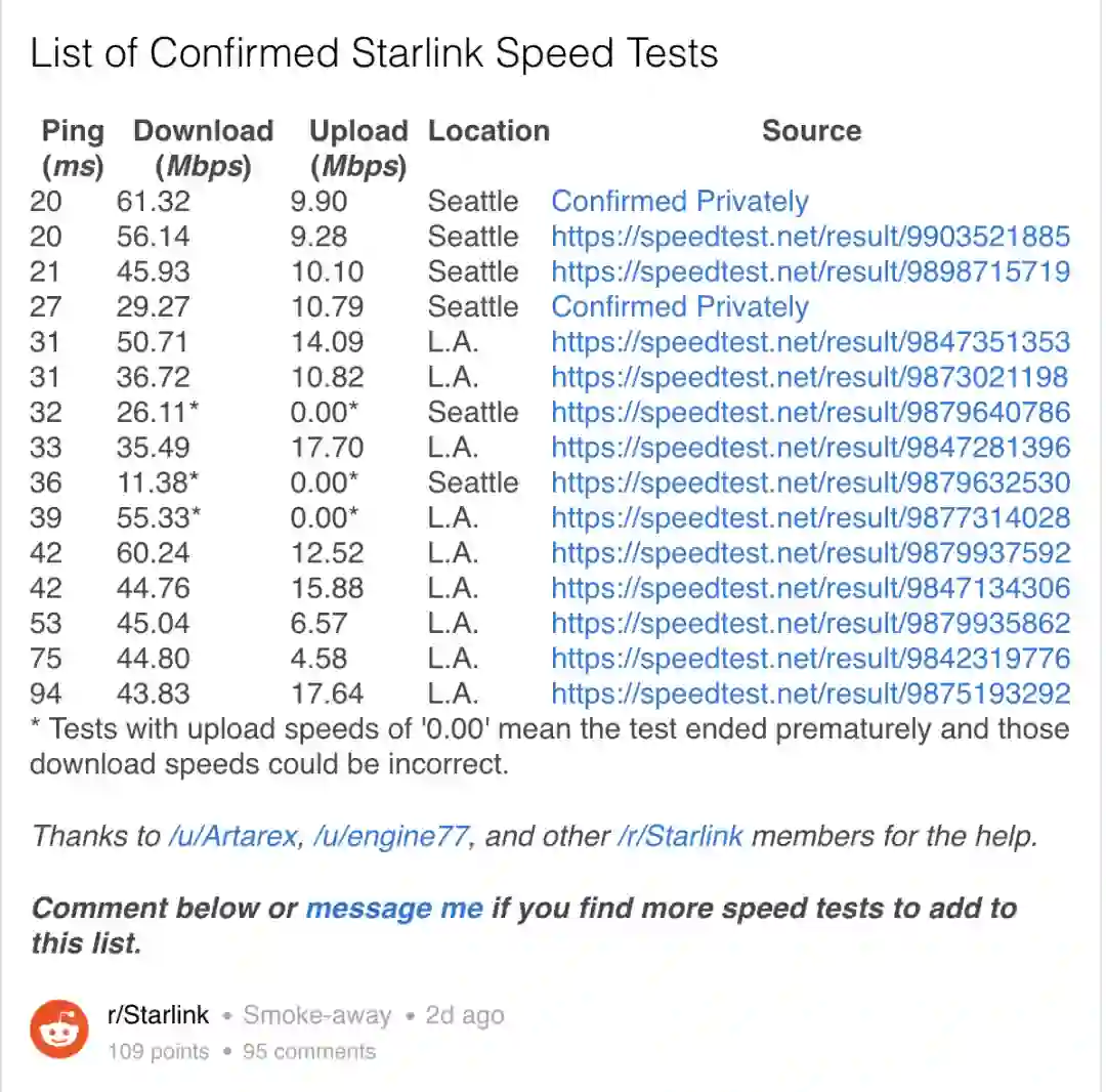 在Reddit的r/starlink话题下,有网友总结了新的Starlink测试速度,并制成了表格。(标记「*」且上传速度为「0.00」的测试,意味着测试过早结束,并且这些下载速度可能不正确。)