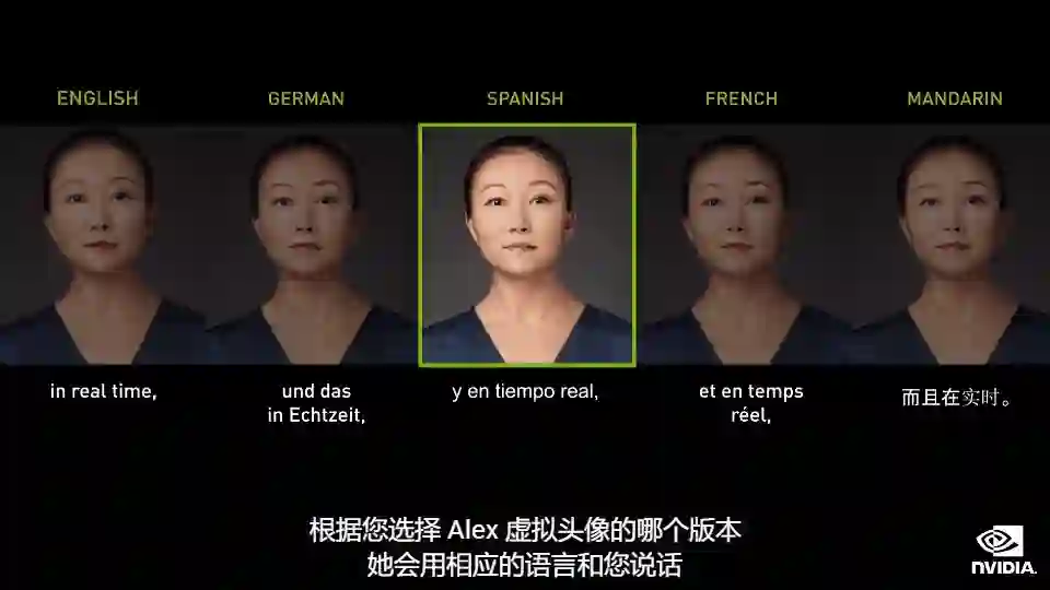 她的化身背后,是英伟达的Video2Face、Audio2Face、2D和3D AI驱动的面部动画和渲染技术。