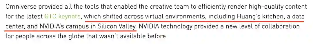 其实,除了老黄的厨房,视频中每次转场的背景也是虚拟环境,包括数据中心和英伟达在硅谷的园区。
