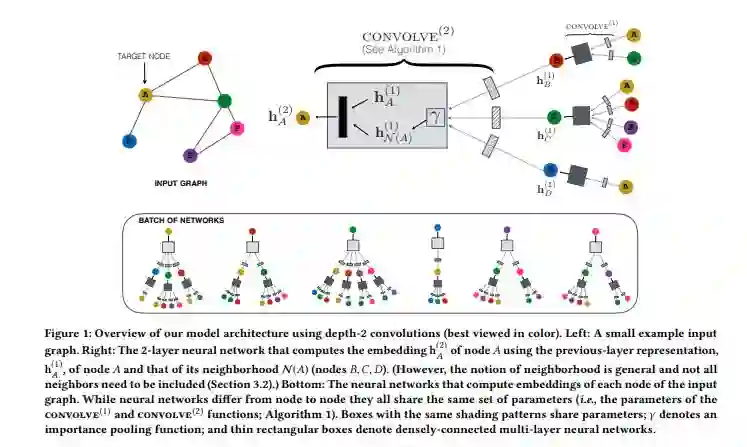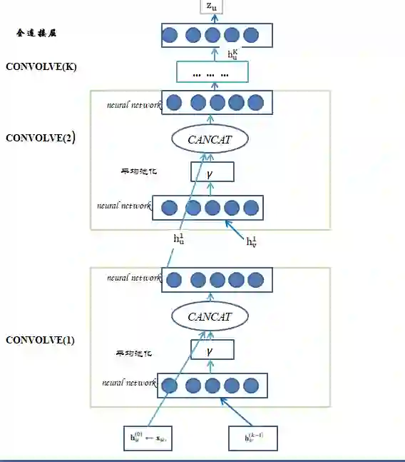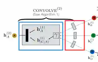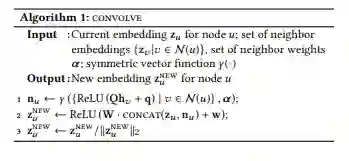 局部卷积操作是算法中最核心的部分,输入为目标节点u的embedding h_u以及节点u对应邻域节点的embedding h_v,输出为包含邻域信息的节点u的新的embedding。