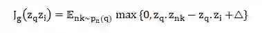 模型要学习的参数为每个卷积层的权重和偏置(Q^(k),q^(k),W^(k),w^(k),∀k∈{1,…,K});最后的全连接层的参数( G^1,G^2,g)。文章中选择 max-margin ranking loss 作为损失函数进行优化,学习这些参数。优化目标为最大化正例之间的内积(查询项q的embedding与推荐的相关项i的embedding之间的距离),确保负例之间的内积(查询项q的embedding与不相关物品的embedding之间的距离)小于通过提前定义好的边界划分出的正例的内积。对于单个节点对的embeddings (z_q,z_i):(q,i)∈L 的损失函数为: