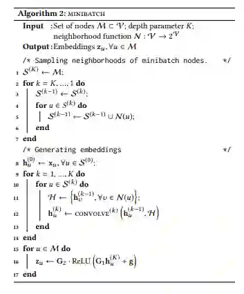 在堆叠卷积模块主要包含两部分,第一部分获得每一层节点的邻域集合(1-6步);第二部分是循环计算每一层的CONVOLVE,并在最后一层通过全连接层进行映射得到最终的embedding(8-17)。