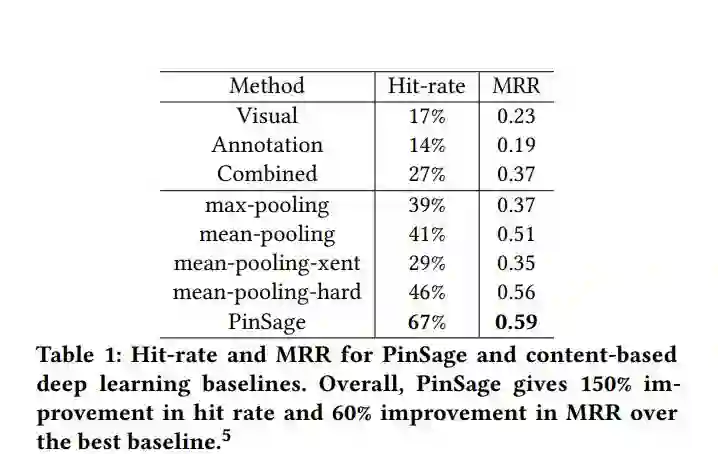 为了更好地评估PinSage算法的性能,作者对比了以下基于内容的,基于图的深度学习方法,表1为模型对比结果: