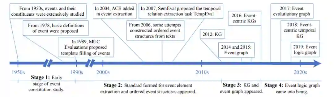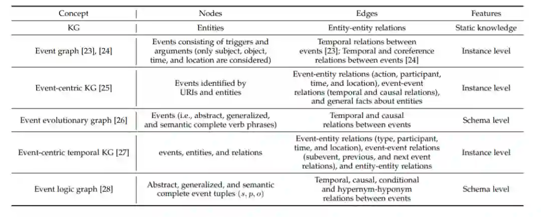知识图谱(KG)是谷歌在2012年发布的一种流行的知识表示形式。它关注名义实体及其关系,因此代表静态知识。然而,世界上存在着大量的事件信息,传递着动态的程序性知识。因此,以事件为中心的知识表示形式(如Event KG (EKG))也很重要,它将实体和事件结合在一起。它促进了许多下游应用,如智能搜索、问答、推荐和文本生成[1]、[2]、[3]、[4]、[5]。
