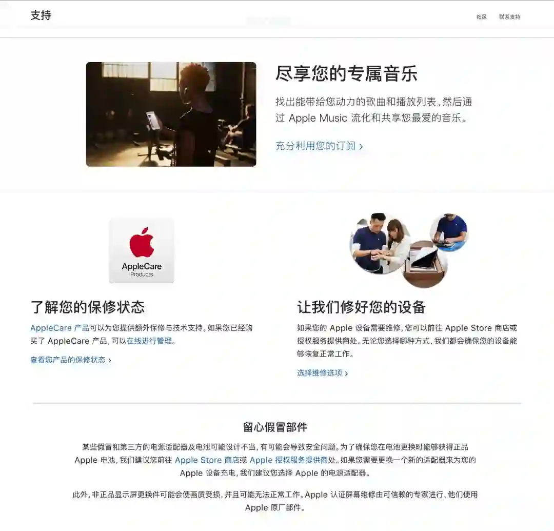 举个例子,比如说一些站点的support,你会看到其实有两种,一种是里面会有更多让你感受到它的工程师或者他的客服。比如Apple,有一个形象和一个团队的支持,support有很多条款,然后很多功能,你可以在先自学,你也可以电话等。仅仅只是内容上展示。这种情况用户感觉就不是太好。