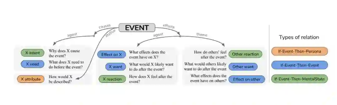 根据论文摘要介绍,与以分类学知识为中心的现有资源相比,ATOMIC 关注的是被组织为 if-then 关系的推理知识(例如,“如果 X 给 Y 给与赞美,则 Y 可能会回赞”)。他们提出了 9 种 if-then 关系类型来区分原因 vs.效果,代理 vs. 主题,自愿 vs.非自愿事件,以及行为 vs. 心理状态。