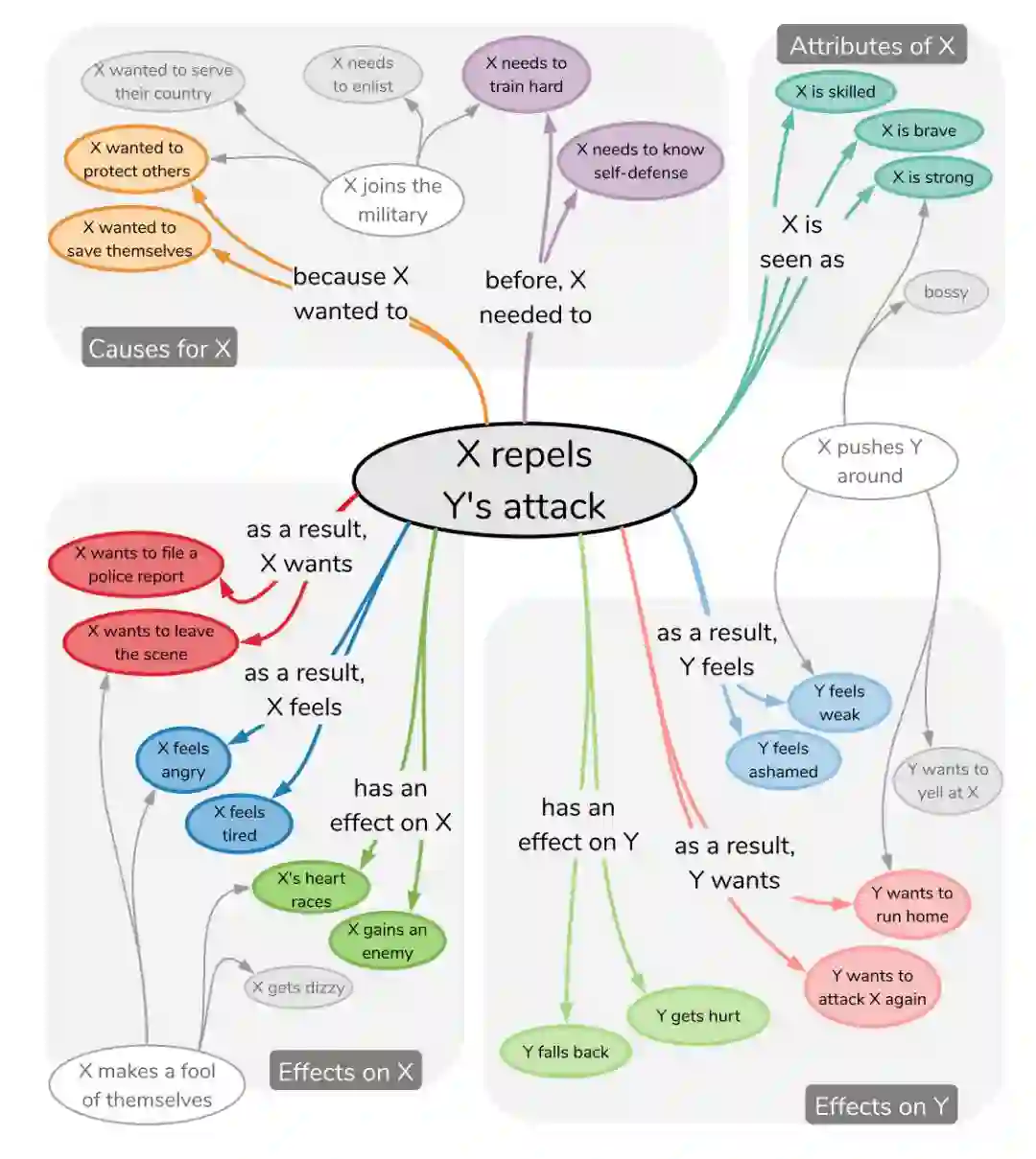 如上图所示,这是 ATOMIC 的一个小子集,是日常事件、原因和结果的机器常识图谱。如果我们观察“X 击退 Y 的攻击”事件,可以立即推断出围绕该事件的各种可信事实。就事件背后的合理动机而言,X 可能是想要保护自己。至于事件发生前合理的前提条件则是,X 可能已经有自卫训练能力来成功抵御 Y 的攻击。我们还可以推断出 X 的合理特征:她可能很强壮、技术娴熟且勇敢。对于这一事件的结果,X 可能会感到愤怒并可能想要报警;另一方面,Y 可能会害怕被抓住并想逃跑。