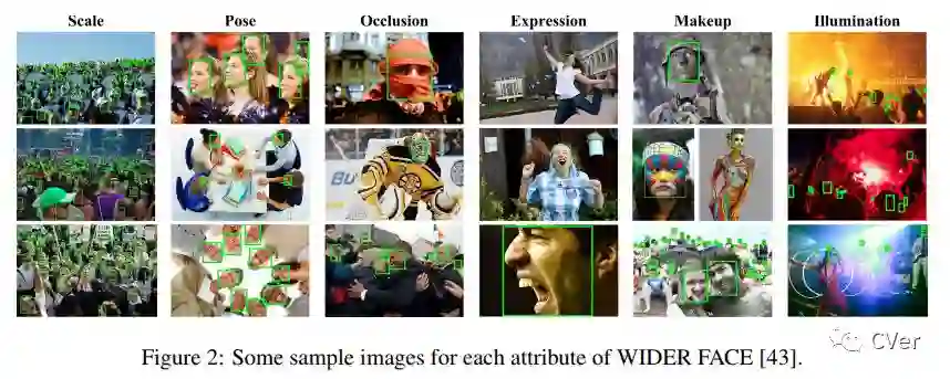 WIDER FACE:32203张图像,393703个标注人脸bbox,小尺度人脸、遮挡、大尺度表情变化等情况特别多;train / val / test:40% / 10% / 50%的比例,并根据检测难度将 val / test 划分为easy、medium、hard三个子集(基于EdgeBox的检测结果划分的),三个子集逐步包含(后面子集包含前面子集的所有图像),train / val 提供 gt 标签,test未提供;