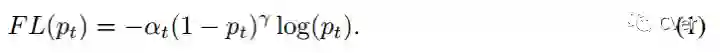 RetinaNet是1-stage的目标检测算法,没有RPN阶段,直接在feature map上做密集的anchor采样(over a regular, dense sampling of possible object locations),速度快;此外,为了解决SSD等1-stage目标检测算法中,训练阶段的正负样本不均衡问题(毕竟RPN还有过滤海量负样本的作用呀,虽然frcnn中RPN通过粗暴的控制正负样本比例为1:3做了负样本过滤),RetinaNet就通过focal loss进一步控制训练阶段的正负样本比例,效果好,如公式(1)、(2):