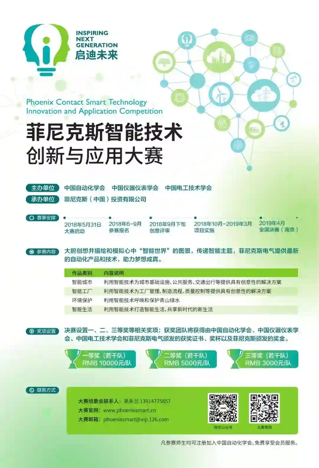 今年起,“I Love Control”中国自动化大奖(以下简称“大赛”),更名为《菲尼克斯智能技术创新与应用大赛》,鼓励创新与应用并举,促学习和运用相统一,理论和实践相结合。大赛由中国自动化学会、中国仪器仪表学会、中国电工技术学会主办,菲尼克斯电气中国公司承办,以“启迪未来Inspiring Next Generation”为口号,面向国内高等院校相关专业的同学开展,致力于搭建学习、互动、交流的平台,在智能引领的新时代下为社会培养创新型人才。