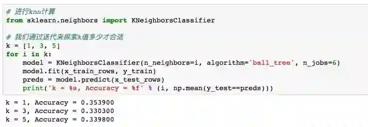 到此为止,我们已经对数据进行了预处理,下面就可以调用 KNN 来进行训练,我分别采用了 K=1,3,5 来看模型的效果。