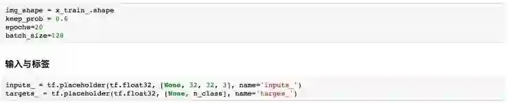 img_shape 是整个训练集的形状,为 [40000, 32, 32, 3],同时我们的输入形状是 [batch_size, 32, 32, 3],由于前面我们已经对标签进行了 one-hot 编码,因此标签是一个 [batch_size, 10] 的 tensor。